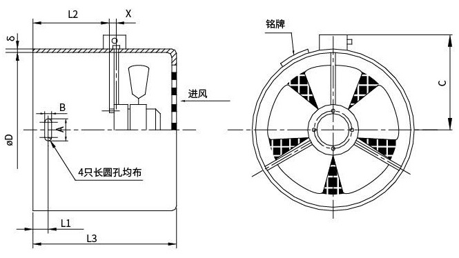 此系列風機主要用于鋁殼電機的強制冷卻,但電機可分為帶尾軸和不帶尾軸,風機尺寸將會做相應調(diào)整,安裝孔為4孔十字均布。